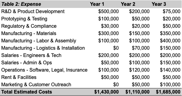 Even with a strong product vision, every startup must understand its cost structure early on. Without clear financial planning, running out of cash before revenue comes in is too easy. OceanFlow's initial years will be capital-intensive, requiring research, team-building, compliance, and manufacturing investments.